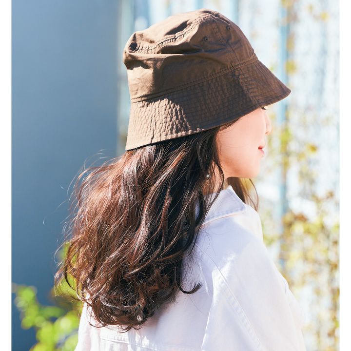バケットハット¥5,280(ニューエラ)シャツ¥19,800(ヘルシーデニム/ゲストリスト)Tシャツ¥3,190(フルーツオブザルーム/ギャレット)ネックレス¥3,630(アネモネ/サンポークリエイト)バッグ¥13,200(グレゴリー/サムソナイト・ジャパン)