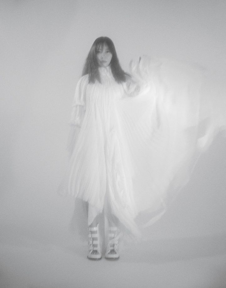 純白のシルクシフォンのドレスは、ランダムにプリーツが施された動きのあるデザイン。「このドレスは、指原さんのような可愛らしい方が纏うとロマンティックになり過ぎてしまうかなと心配していましたが、実際に着ていただいたら、儚げな佇まいになったのが嬉しいサプライズでしたね。凛とした芯の強さがあるからこその“儚さ”。まさに、指原さんの持つ“知られざる一面”を洋服が映し出したルックだと思います」