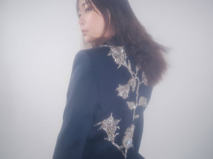 端正さとアヴァンギャルドなマインドの共存。クチュールジャケットの背中には、立体的なビーズ刺繍で描かれた薔薇が華やかにきらめき、ボトムはプリーツミニにアシンメトリーなラッフルスカートをレイヤード。「このルックを堂々と着こなす指原さんに、マックイーンの服と同じ“パンクな精神”を感じました。“何者にも媚びない自分”があるからこそ着こなせる服だと思います」。