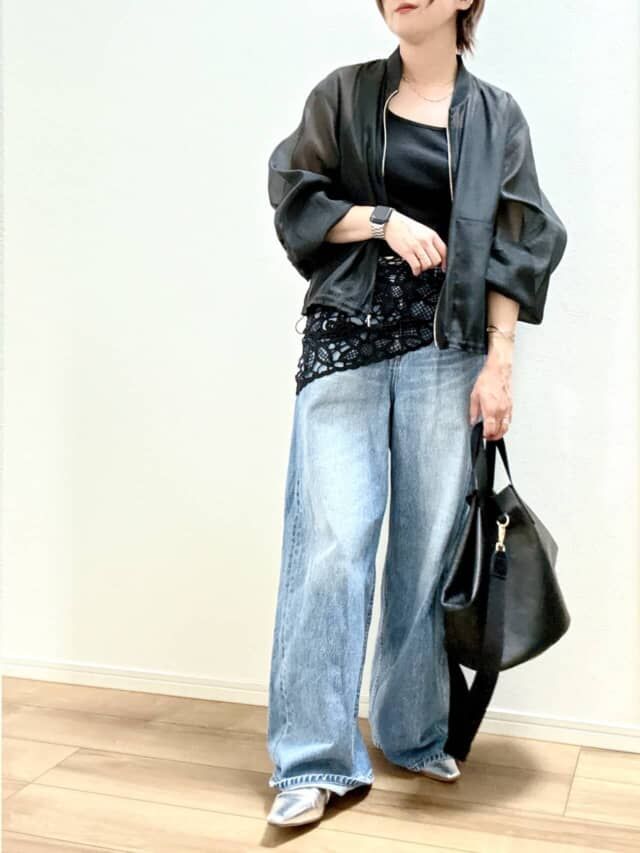例えば、シアーブルゾン×デニムというカジュアルなコーデに、サッとクロシェスカーフをプラス。ベルトよりも優しい雰囲気が出て、ほんのり甘さとこなれ感が漂います。透かし模様のクロシェ編みが涼しげに見せてくれるから、春夏の軽やかスタイルにもぴったり。さらに、腰周りに自然な立体感が生まれるので、気になるラインもふんわりカバーしつつ、シンプルなデニムコーデもグッと華やかに格上げできます。