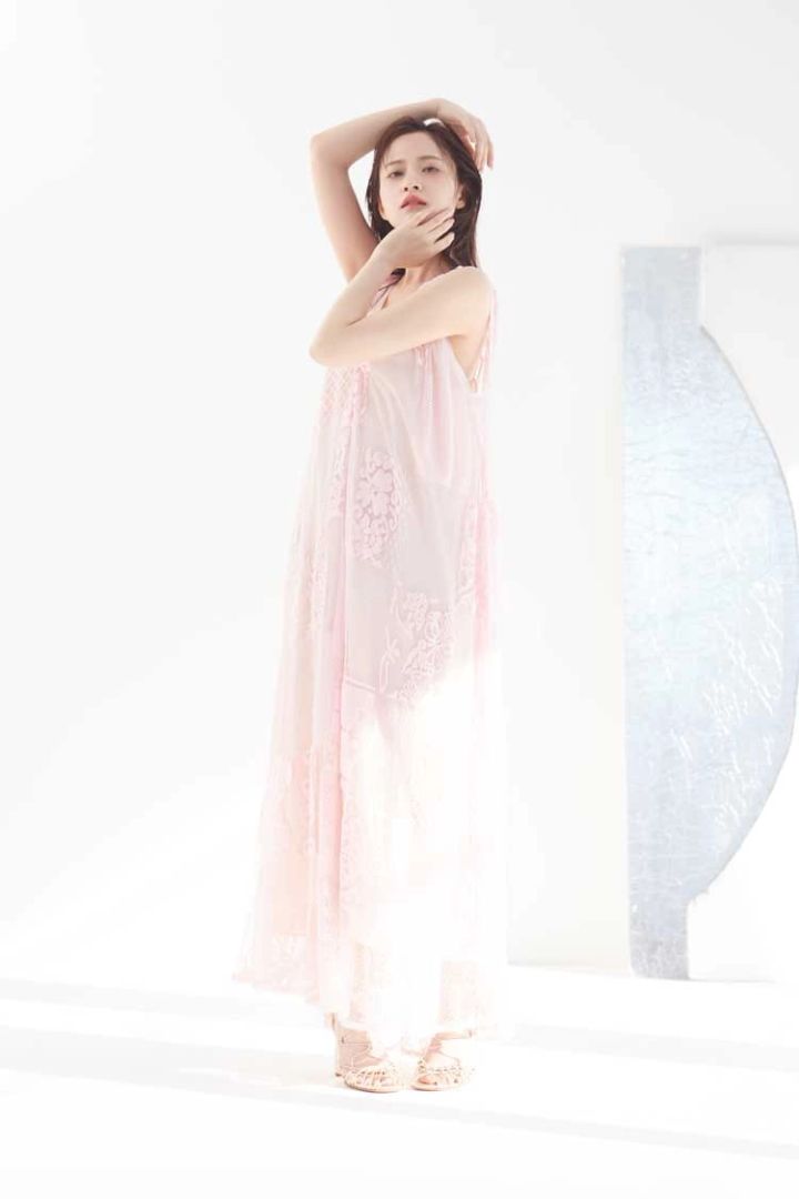 ピンクレースロングワンピース 185,900円、ゴールドレースアップサンダル 143,000円/ともにフォルテ フォルテ(コロネット)