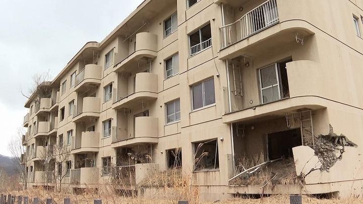 下から数えて3つ目、本来4階のベランダの柵が大きくひしゃげた部屋が、荒町さんのかつての「我が家」でした。