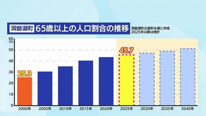 洞爺湖町で65歳以上の年齢が占める割合は、2000年の噴火の際は25.3%でしたが、25年で倍近くまで増えていて、今後も増え続けると予測されています。