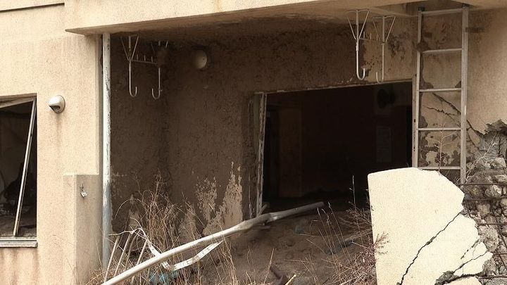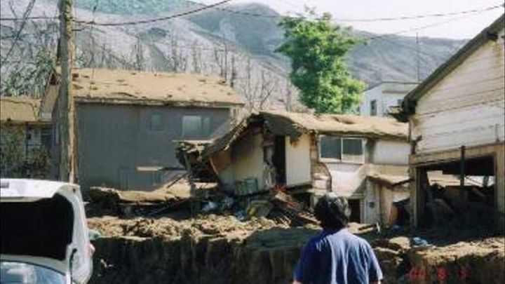 ここ桜ヶ丘団地は、2000年の噴火により泥流が流れ込み、噴石と火山灰が降り注ぎました。1階部分は泥流で完全に埋まっています。