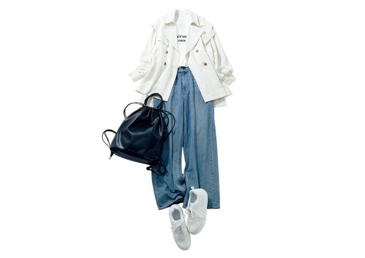 2WAYトレンチコート¥39,600/ルーニィ ロゴTシャツ¥4,990/アンフィーロ(オンワード樫山) ワイドデニムパンツ¥17,600/マイストラーダ リュック¥17,600/Stola. スニーカー¥2,990/GU