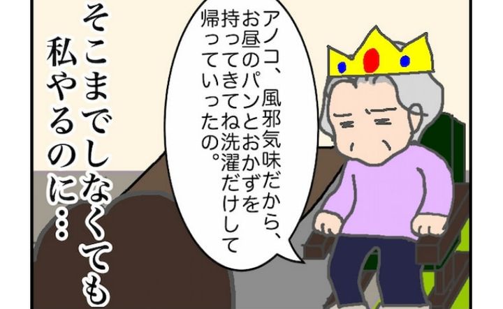 そんなある日。私が仕事から帰ると、いつもなら義姉と談笑する声が玄関まで聞こえるのに、やけに静かです。義母の部屋を覗くと義姉の姿はなく、義母から「風邪気味だからお昼を持って来て、洗濯だけして帰った」と聞かされました。義母はご機嫌ナナメだったものの、介護は先が見えないので、無理をし続けるわけにはいきません。義姉のためにも、体調が悪いときは、ゆっくり休んでほしいです。