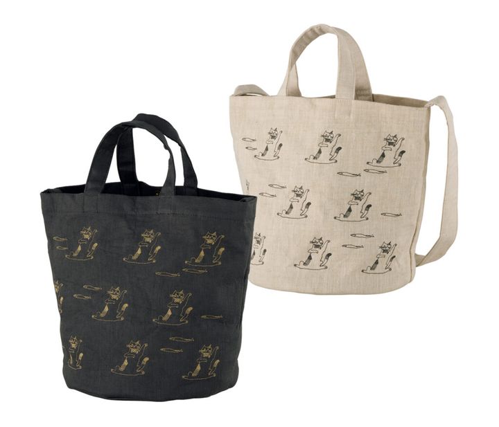 料理人で作画家としても活躍する中西なちおによる〈トラネコボンボン〉と〈ロワズィール〉とのコラボレーションバッグは、猫がシシャモと踊る柄の刺繍に心が和む。自立するバケツ型で、内ポケットやショルダーストラップも備え、使い勝手も申し分なし。やさしい風合いのリネン混コットンは軽さも魅力。同柄のTシャツもあり。