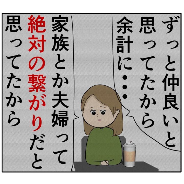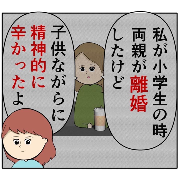 「ずっと仲良いと思ってたから余計に・・家族とか夫婦って絶対の繋がりだと思ってたから」と、両親が離婚したときに辛い思いをしたと語った友人。