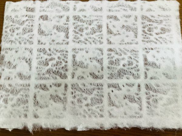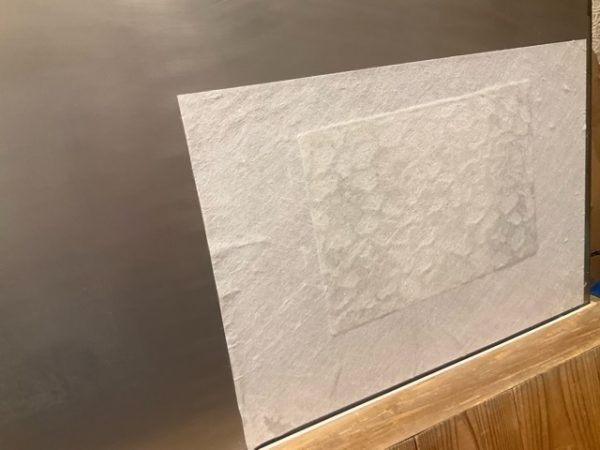 そして、次が模様付け。この落水紙は水滴と型を使って模様を付けます。シャワーの水圧で模様を付けていきますよ。