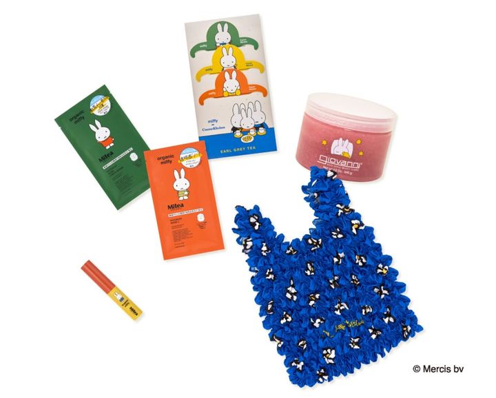 A4サイズも入る限定エコバッグに、ボディスクラブ、オーガニックアールグレイティー、シートマスクとリップスティックが入った限定キット。ミッフィーの絵柄つきで可愛いかつ、絶対に使えるモノ揃いの点が嬉しい。リラックスタイムに、ミッフィーがより癒やしを与えてくれるはず。