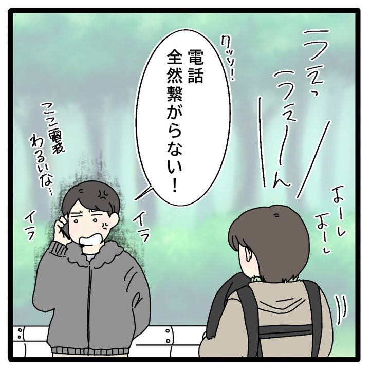ですが、山に入ったせいか何度電話を掛けても義母につながらずヨシオは「電話全然繋がらない!ここ電波わるいな・・・」とさらにイライラしはじめてしまいました。