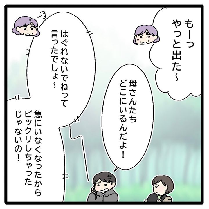 ヨシオが「母さんたちどこにいるんだよ!」と言うと「はぐれないでねって言ったでしょ~急にいなくなったからビックリしちゃったじゃないの!」とヤレヤレといった様子。