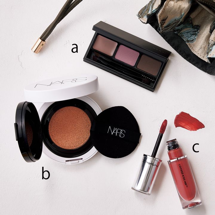 a.上品なしっかり眉に。OSAJI ブロウシャドウ パレット 05 ¥4,180(OSAJI)b.みずみずしい肌に。ライトリフレクティング セラムクッションファンデーション 03789 SPF42・PA++ ¥8,580(セット価格)(NARS JAPAN)c.落ちないので話すことに集中できて◎。M・A・C ロックド キス インク リップカラー ブラッシング ¥5,170 (M・A・C)