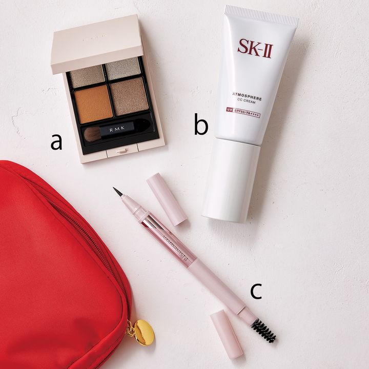 a.モード感あるグリーンでおしゃれに。RMK シンクロマティック アイシャドウパレット 09 ¥6,380 (RMK Division)b.みずみずしい肌に。アトモスフィア CC クリーム 30g ¥11,550(SK-II)c.描きやすくて滲まない! スタイルロック アイブロウ リキッド&パウダー ナチュラルブラウン ¥2,860 〈編集部調べ〉(花王)