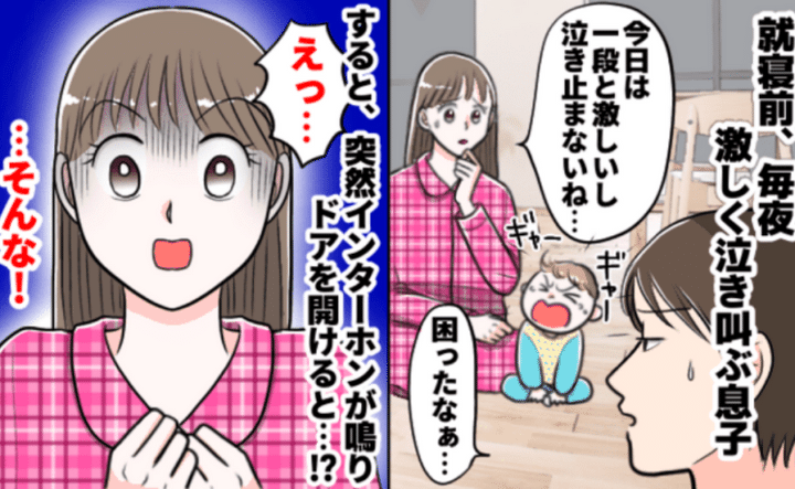 「ウソでしょ!?」息子が激しく泣いていた夜…突如響くインターホンの音。玄関前には衝撃の人物が!?