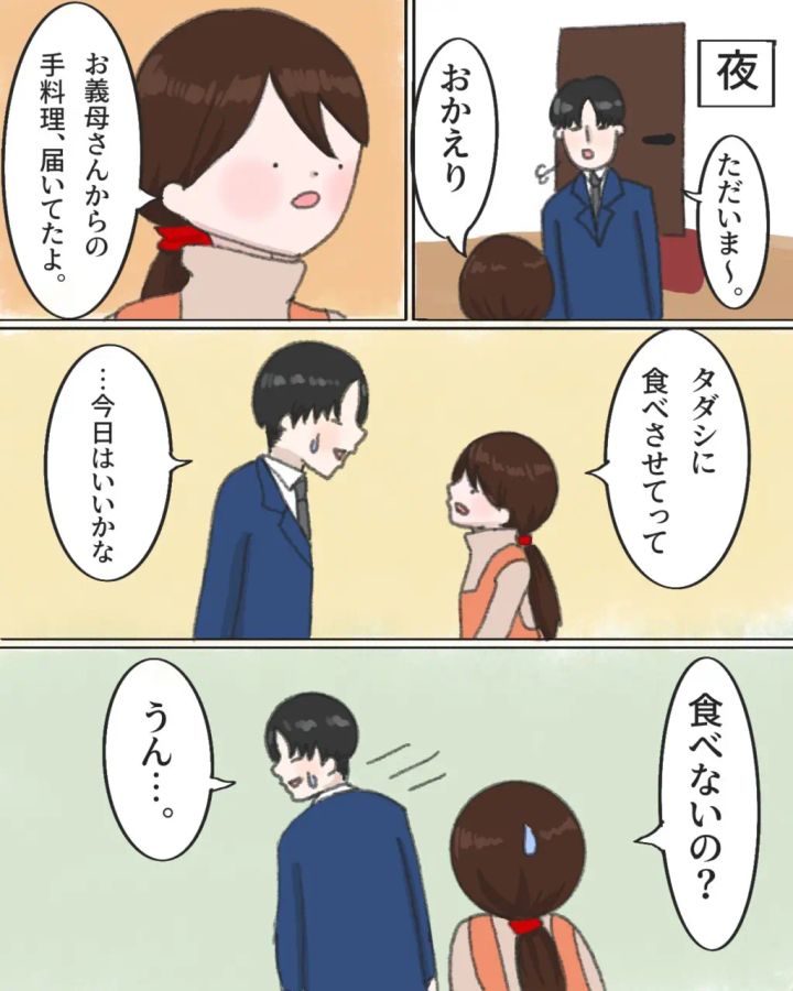義母から常温の手料理が再度送られてきたことを帰宅した夫に伝えました。「タダシに食べさせてって。」と義母の言葉を伝えましたが、「今日はいいかな」と動揺する夫。あんなにお義母さんの料理は元気になる、美味しいといつも言うのに。「食べないの?」と念を押すと「うん」と言いながら背を向けてしまいました。