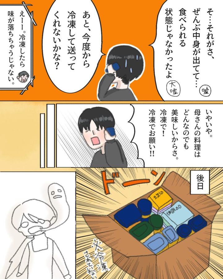 「お願いだから、送るなら冷凍された状態で送って欲しいって伝えて!」私のことばに夫も「分かった」と言うしかなく、義母に電話しました。義母はタダシからの連絡に「あっ食べた~?タダシの好きなもの、たくさん入ってたでしょ?」と嬉しそうです。