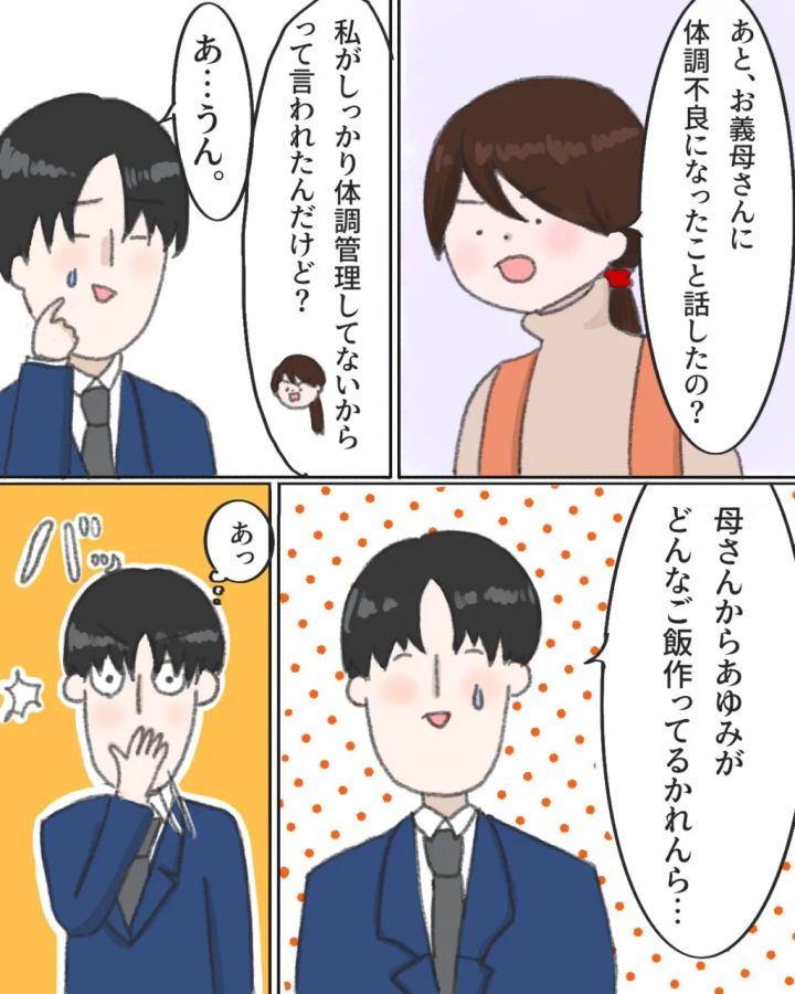 すると夫は「母さんからあゆみがどんなご飯作ってるかれんら・・・」と言いかけてハッと口をつぐみました。つい口を滑らせたようです。