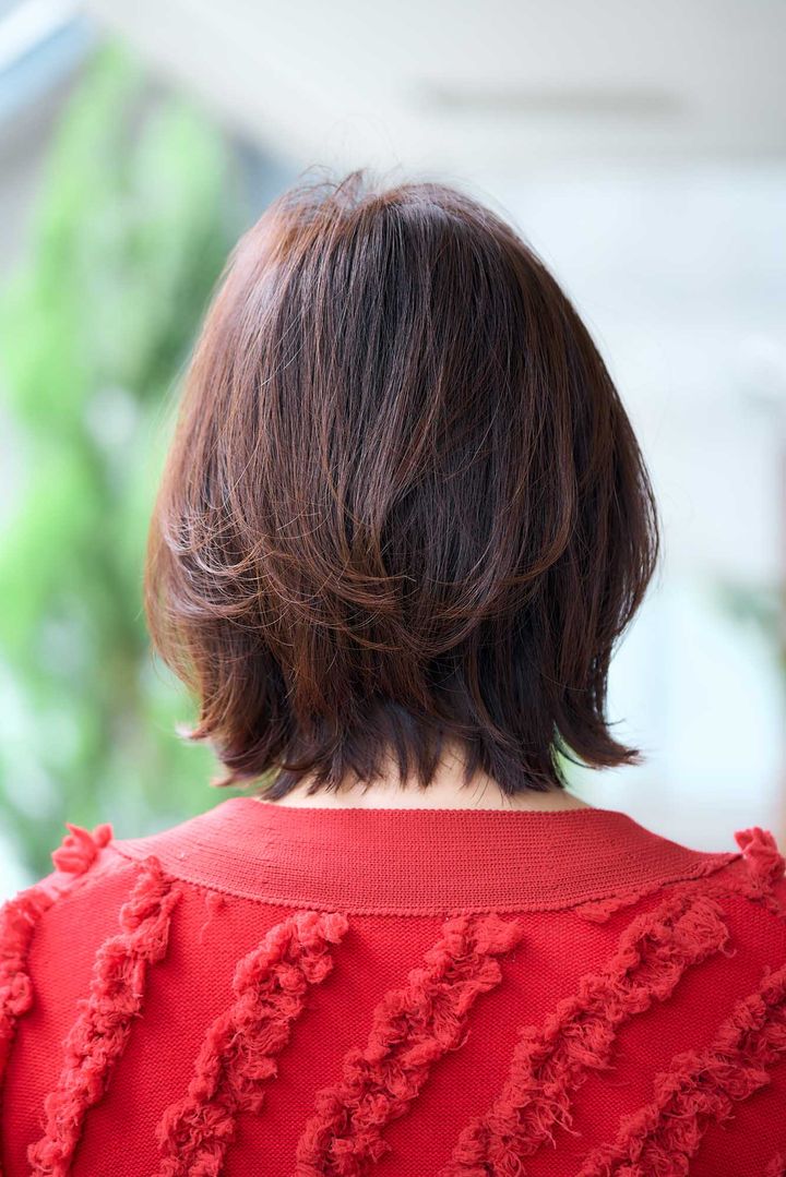 【ご本人感想】今までは結べて楽にできる髪型ばかりを優先させてきましたが、こんなにもヘアスタイルで印象が変わることを知り驚きと嬉しさでいっぱいです。自分で髪に動きをつけることは難しいと思っていましたが、カットのおかげで自然に顔に髪がかかり、動きや軽さがでてステキに仕上がり楽ちんです。これから秋に向けてもっとオシャレを楽しみたいです。