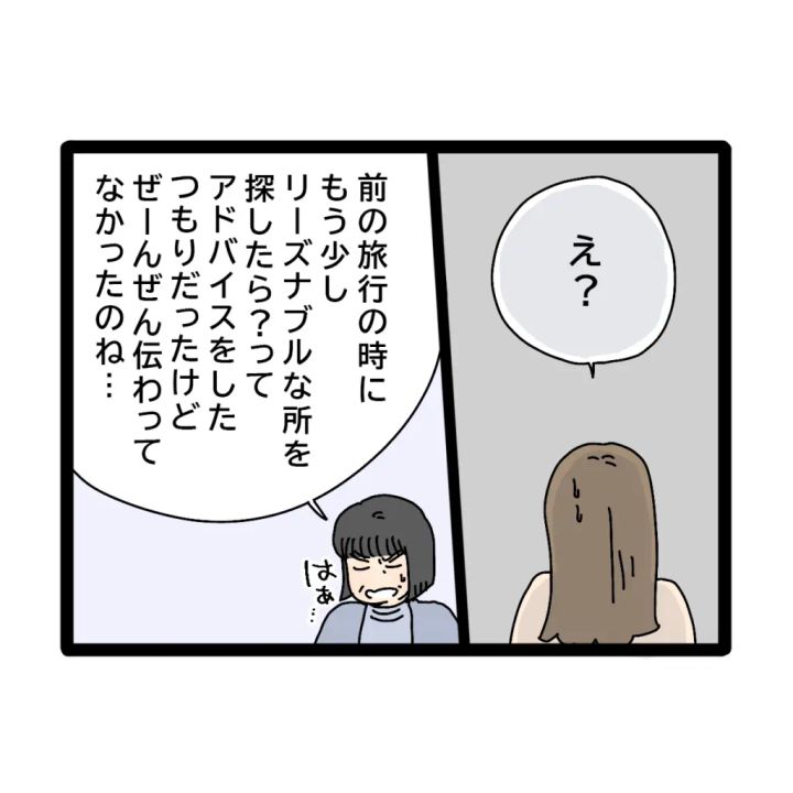 「え?」アヤカさんが聞き返すと、「はぁ・・前の旅行の時に、もう少しリーズナブルな所を探したら?ってアドバイスをしたつもりだったけど、ぜーんぜん伝わってなかったのね・・」と呆れたように義母が言いました。