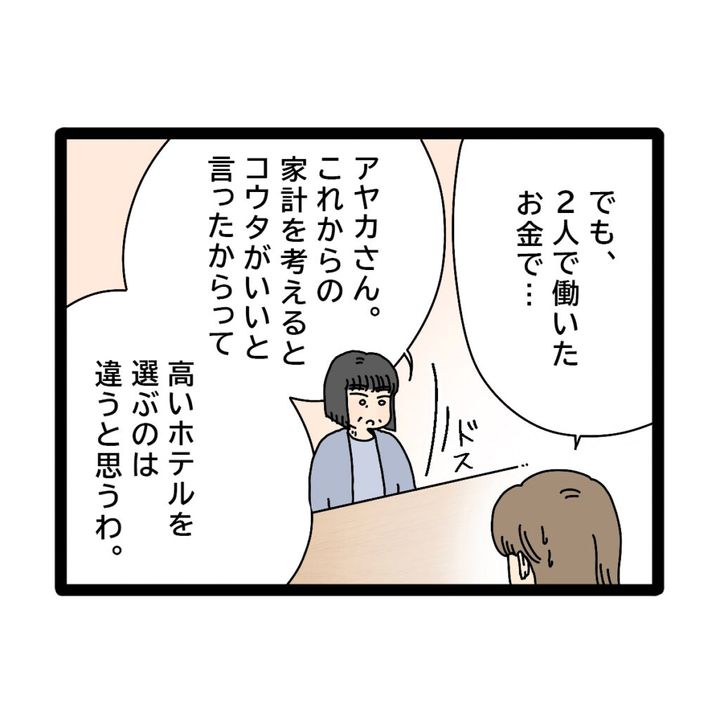 「でも、2人で働いたお金で・・」アヤカさんが静かにそう言うと、「アヤカさん。これからの家計を考えると、コウタがいいと言ったからって、高いホテルを選ぶのは違うと思うわ。義母がアヤカさんの目の前に座ってそう言いました。