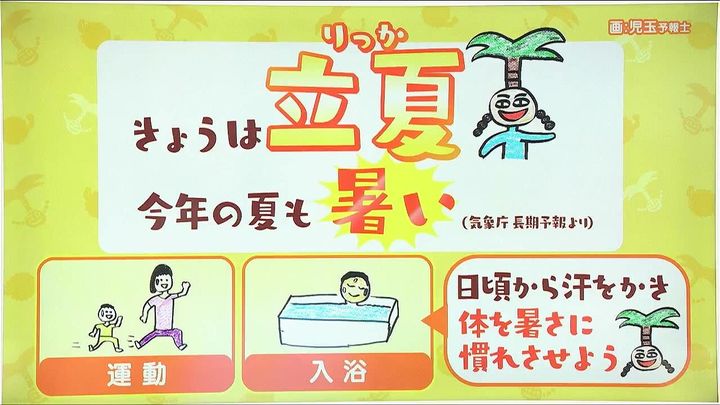 暦の上ではきょうから夏に入ります。気象庁の長期予報によると今年の夏も気温は平年より高く、暑い夏になります。熱中症はうまく汗をかけずに熱が体にこもることで発症します。日頃から運動や湯船に浸かることで汗をかく習慣をつけて、体を暑さに慣れさせましょう。5月でも急に暑くなることがあるので、意識したいですね。