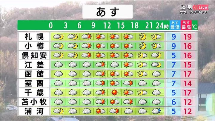 あす6日(火)の時間ごとの天気。道央・道南からです。