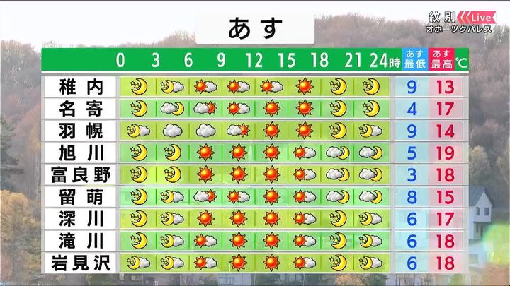 多少雲がかかる程度で、晴れるでしょう。最高気温は旭川や岩見沢など内陸で20度近くまで上がり、昼間は上着なしで過ごせそうです。