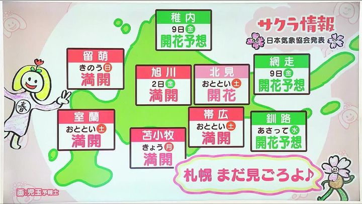 今年の札幌はサクラが開花してから寒の戻りがあったことも影響して、サクラが長く楽しめています。函館でもまだ見ごろになっています。サクラ情報ですが、先週末は北見で開花、留萌や旭川、室蘭、帯広では満開、きょうは苫小牧でも満開になりました。日本気象協会によると稚内や網走、釧路でも今週中に開花する予想です。