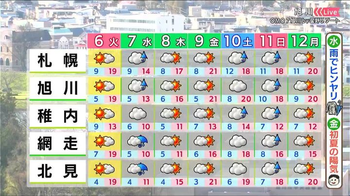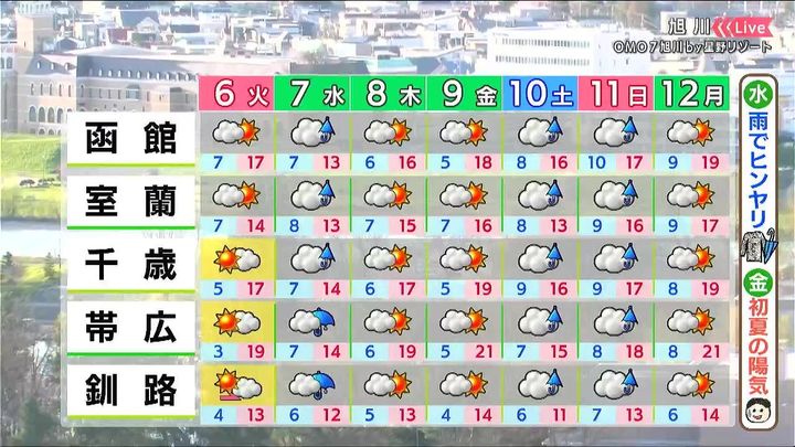 連休明けの水曜は雨が降り、特にオホーツク海側で空気がヒンヤリしそうです。木曜と金曜は日差しが出て、金曜の最高気温は札幌で21度など、初夏の陽気です。