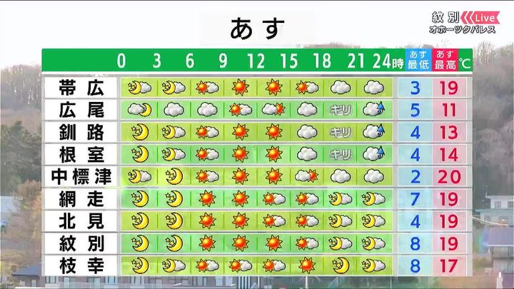 日中は各地で晴れる見込みです。夜は道東の海岸部で霧雨や小雨が降るでしょう。内陸やオホーツク海側では朝晩と日中の気温差が大きくなります。