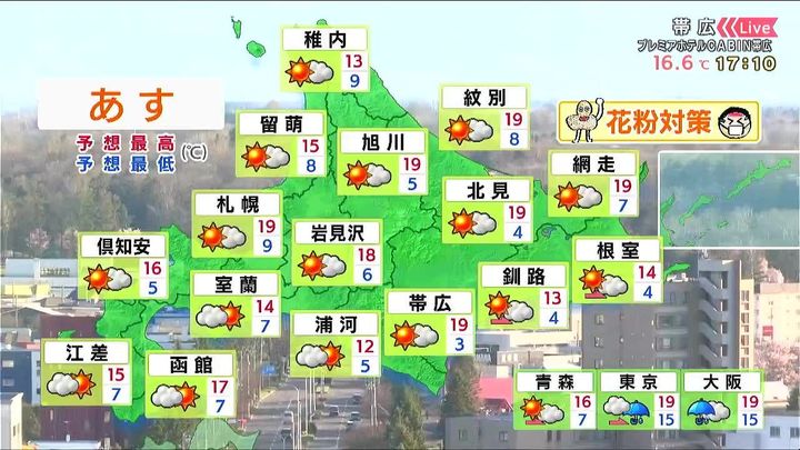少し霞んだ「春霞の空」となりますが、日差しは届くでしょう。最高気温は札幌で19度と暖かくなります。夜遅くになると浦河で雨が降り出すでしょう。