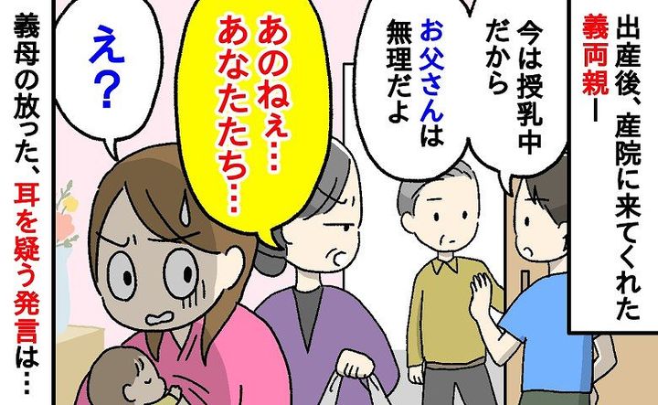第1子を出産し、入院中だったある日。慣れない授乳に必死になっていた私の病室に、義両親がやって来ました。タイミング的に気まずいと思った夫が義父の入室を止めてくれたのですが……。そのとき、義母が放った言葉に私は思わず耳を疑いました。
