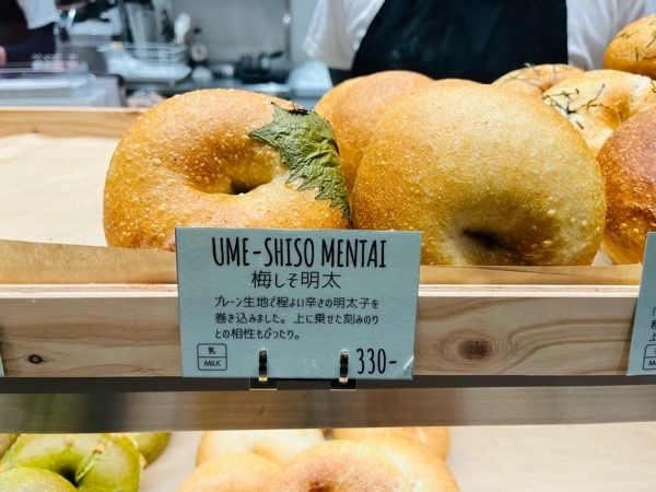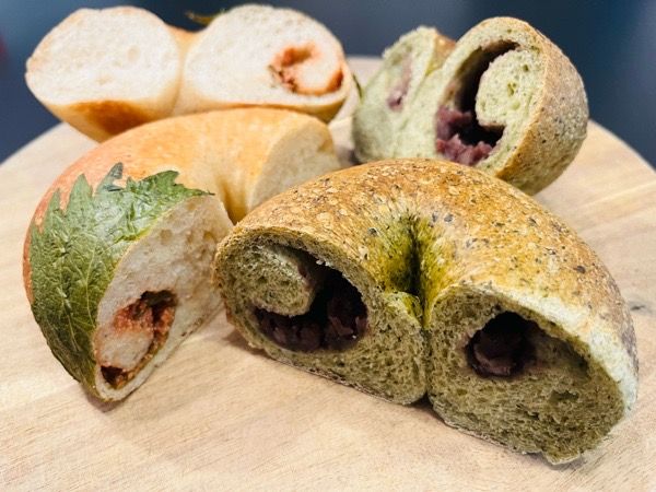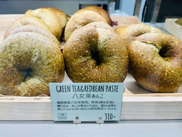 それから「梅しそ明太」「八女茶あんこ」をチョイス。限定に弱いもので(笑)切る時に感じる生地のふかっと感。食べると感じるベーグル特有のもちっと感。「やまや」のぴり辛明太子とシソの風味、生地に練りこんである八女茶の優しい香り、満足感が味わえます。