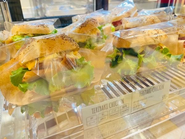 たっぷり具材を挟んだサンド。食べ応えのあるおかず系ベーグルサンドも豊富なのでランチにも良さそうです。「チキンカツ」や「エビカツ」、「ベーコンエッグチーズ」などガッツリ系もありました。