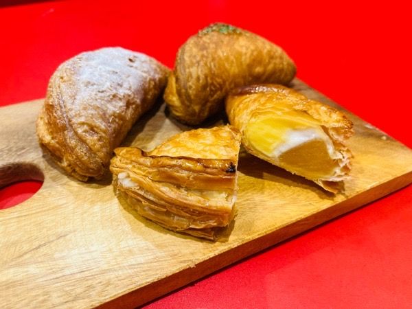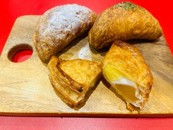 他にも、博多明太子とモッツァレラチーズ、ポテトを包んで焼き上げた「世界一の明太チーズポテトパイ」(写真右上)、特製ストロベリーカスタードと博多あまおうのコンフィチュールが入った「世界一のあまおうストロベリーパイ」(写真左上)が博多マイング店限定で販売されています。食べ応えがあって軽食にもなるのが嬉しいし、またここでしか買えないという特別感もあります。