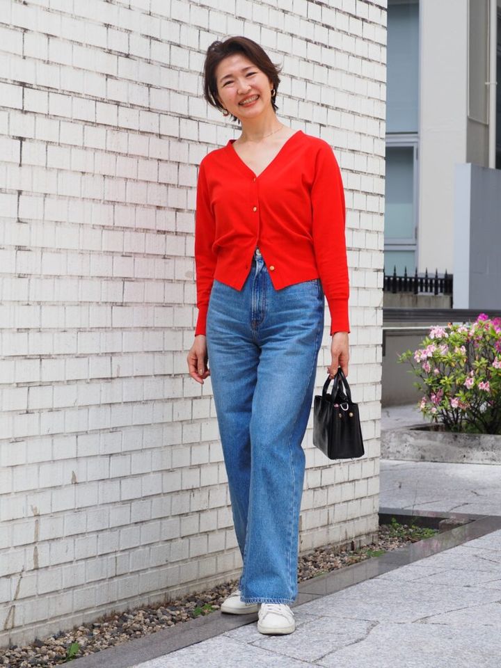 「最近イメチェンをして、洋服選びも変わりました」と話すゆうらんさん。ゆるふわなテイストから一変、ジャケットやデニムなど、メンズライクなアイテムを取り入れるようになったのだとか。この日は鮮やかな赤のカーディガンにデニムをセレクト。肌映りのいい発色と首元が大きく開いたデザインでヘルシーな印象に。パンツはややワイドなストレートシルエットを選ぶことで、脚長効果を存分に発揮!