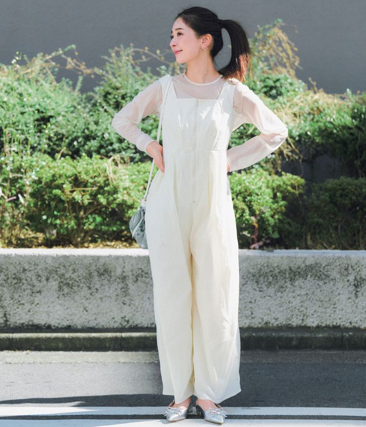 高めの腰位置で脚長効果抜群のジャンプスーツは撥水機能付き。足元は取り外し可能なベルト付きだから、気分や靴に合わせてシルエット変化も楽しめます。ストレスフリーな機能性アイテムでALLホワイトコーデも臆せずチャレンジ!