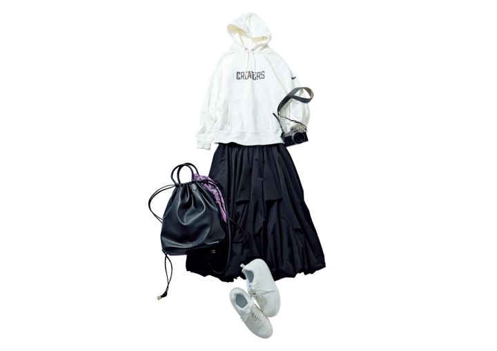 バルーンスカート¥20,900/マイストラーダ リュック¥17,600/Stola. スニーカー¥2,990、ペイズリーバンダナ¥990/ともにGU パーカ参考商品、Zfc 16-50 VR レンズキット¥150,700/ともにニコン