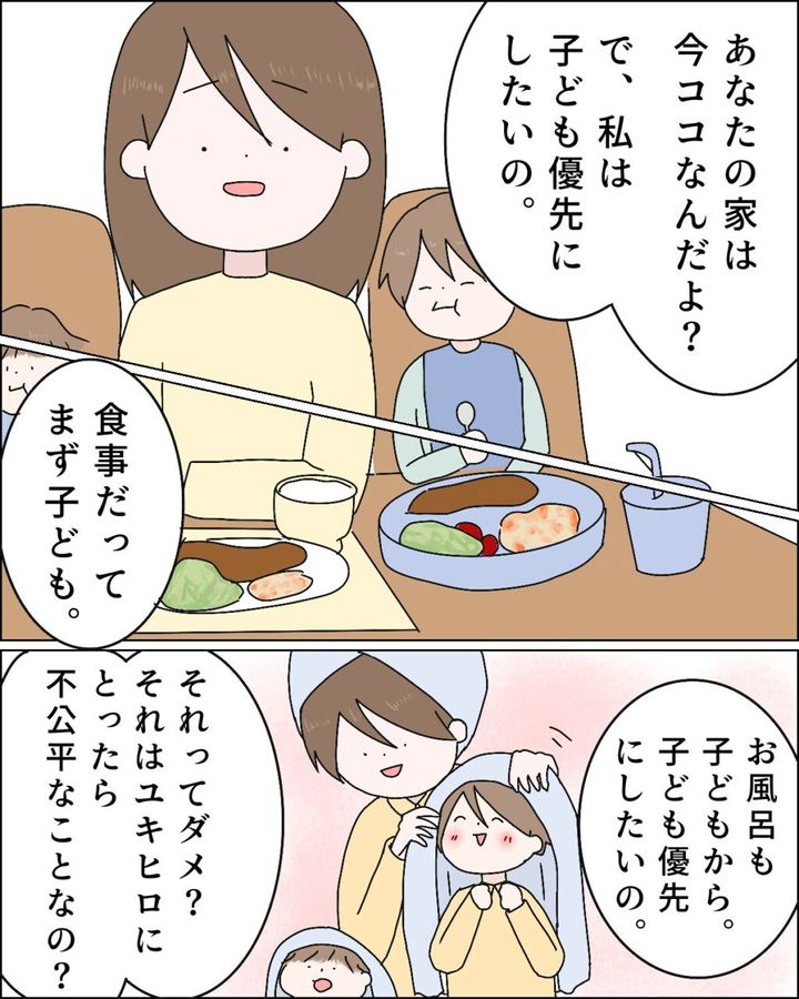 「あなたの家は今ここなんだよ?で、私は子ども優先にしたいの。」いい加減に、結婚して2児の父親だと自覚して欲しい。「食事だってまず子ども。お風呂も子どもから。子ども優先にしたいの。それってダメ?それはユキヒロにとったら不公平なことなの?」と問い詰めました。