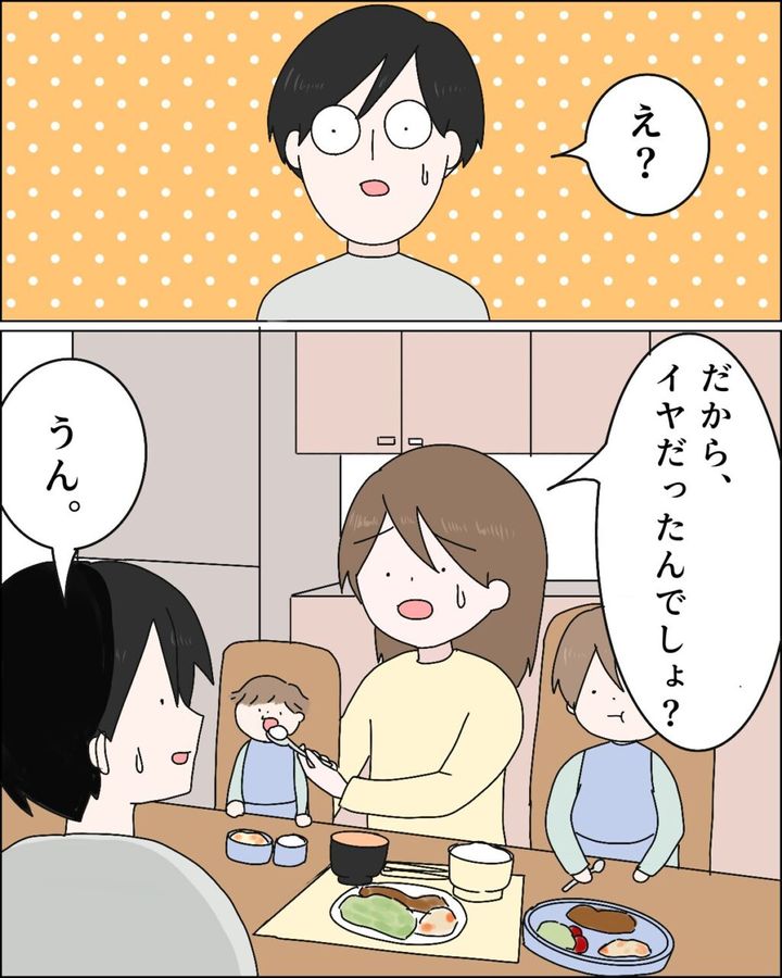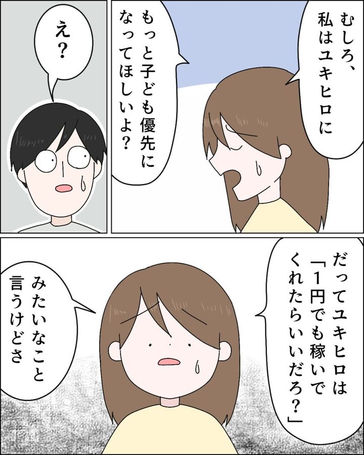 夫に少しがっかりした気持ちになりつつ「むしろ私はユキヒロにもっと子ども優先になって欲しいよ?」と言いました。「だってユキヒロは『1円でも稼いでくれたらいいだろ?』みたいなこと言うけどさ。」と、会社から遅く帰ってきたユキヒロがいつも言うセリフに思うところがある私。普段から不満に思っていたことをこの際伝えようと思いました。