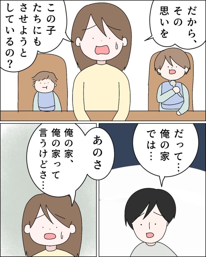 「だから、その思いをこの子達にもさせようとしているの?」私は両隣で静かに食事をしながら夫を見つめる息子たちの真ん中で、もう一度夫に尋ねました。「だって・・・俺の家では・・・」またそれ?このままでは堂々巡りです。「あのさ、俺の家、俺の家って言うけどさ」と私は少し呆れて言いました。