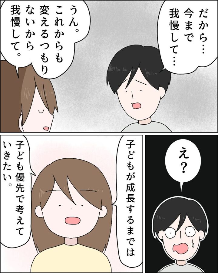 ユキヒロは、「だから・・・今まで我慢して・・・」とまだ言います。「うん。これからも変えるつもりないから我慢して。」と言いました。ユキヒロは驚いていましたが、「子どもが成長するまでは子ども優先で考えていきたい。」と、キッパリ宣言しました。今まで我慢したって言うけど、ナツキはまだ0歳なのに。