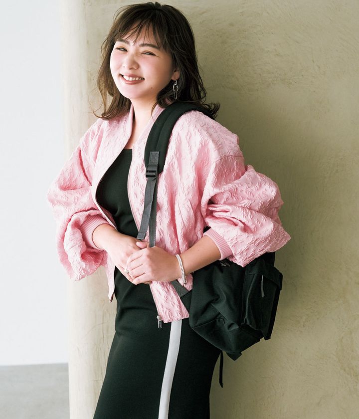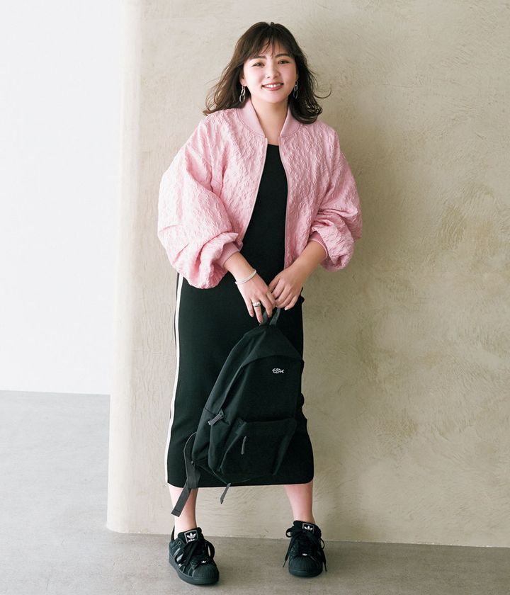 ブルゾン¥27,500(メゾンスペシャル/メゾンスペシャル 青山店)ワンピース¥29,700(THIRD MAGAZINE)バックパック¥16,500(シー/エスストア)スニーカー¥16,500(アディダス オリジナルス/アディダス コールセンター)ピアス¥8,800ブレスレット¥15,400(ともにワンエーアールバイウノアエレ/ウノアエレ ジャパン)リング¥22,000(ココシュニック オンキッチュ/ココシュニック)