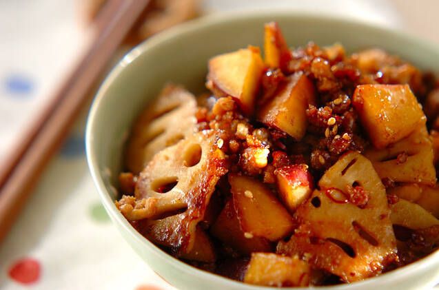 シャキシャキ食感のレンコンと、ほっこり甘いサツマイモに鶏ひき肉を加えて作る、絶品きんぴらです。食べ応えがあり、甘辛い味付けでごはんによく合います。