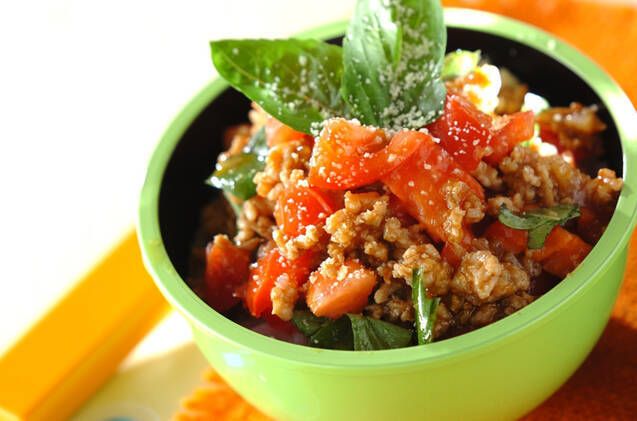 お弁当作りに欠かせないそぼろ。トマトやバジル、粉チーズで洋風にアレンジすると飽きずに食べられます。ヘルシーな鶏ひき肉で作るためダイエット中の方にもおすすめです。