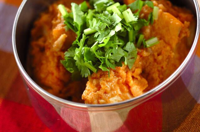 エスニック料理でよく登場する鶏ひき肉。こちらは厚揚げと合わせたボリューミーなおかずです。ピーナツバターに、みそやナンプラーを加えた濃厚な味わいは新鮮! 仕上げに香菜をのせて食べてくださいね。