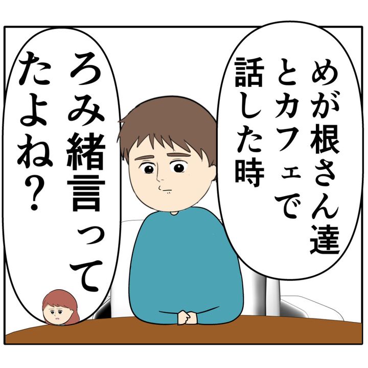 何も言えず俯くろみ緒さんに、めいさんはさらに言葉を続けます。「めが根さん達とカフェで話した時、ろみ緒言ってたのよね?」と、ジュリ実さんとジュリ実さんの夫めが根さんと4人で話し合った時のろみ緒さんの言葉を挙げました。