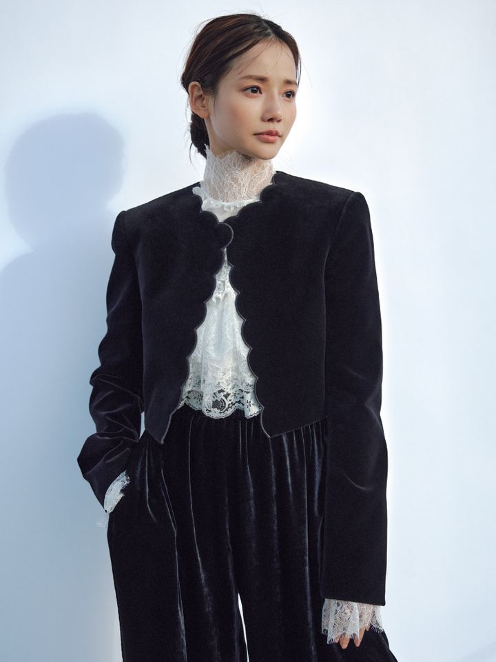 首元とフロントに施されたアールデコ調なスカラップ刺繍が愛らしいなショートジャケット。マットなコットンベルベットやレーシーなブラウスがクラシカルなムードを後押し。ボトムはバミューダパンツでボーイッシュにハズして。