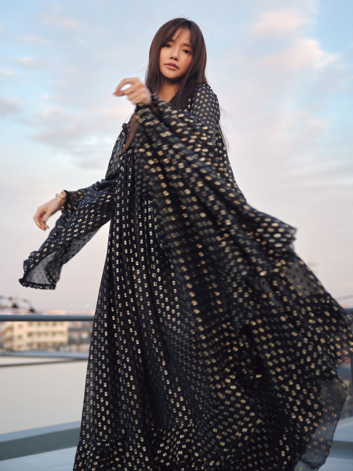 創業者のスピリットをたっぷりと感じられる、新クリエイティブ・ディレクターのシェミナ・カマリが発表したコレクション。シルク素材のエアリーなドレスは新クロエを象徴するルック。ブラックにゴールドのドットジャカードをちりばめた繊細な煌めきが情緒的。
